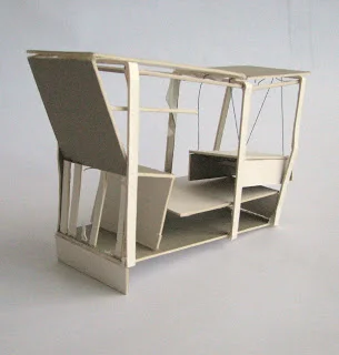 Finally we looked at a Marine Centre in the Scottish Highlands. This project began with an interesting site visit to Glenuig, during which we had to design our own shelters to stay in. My site was an old quarry beside the road into Glenuig. The quarry had been used to re-surface the road, this feature can be seen in the model images, but I was more interested in the siting of the old road into Glenuig which was a barely cobbled track over the hillside. As my brief was for a Marine Centre, I decided to site it on the hillside overlooking the bay and out to sea where the skyline is dotted with islands. The building provided a cafe, exhibition areas, then more private spaces for laboratories and offices. I decided to provide most of the access along the buildings width with ramps, and therefore decided to lift the building up on stilts to preserve the landscape below, and the original road which became the access route for the public. The entire building was clad in cedar so that it would age and blend with the landscape around it.